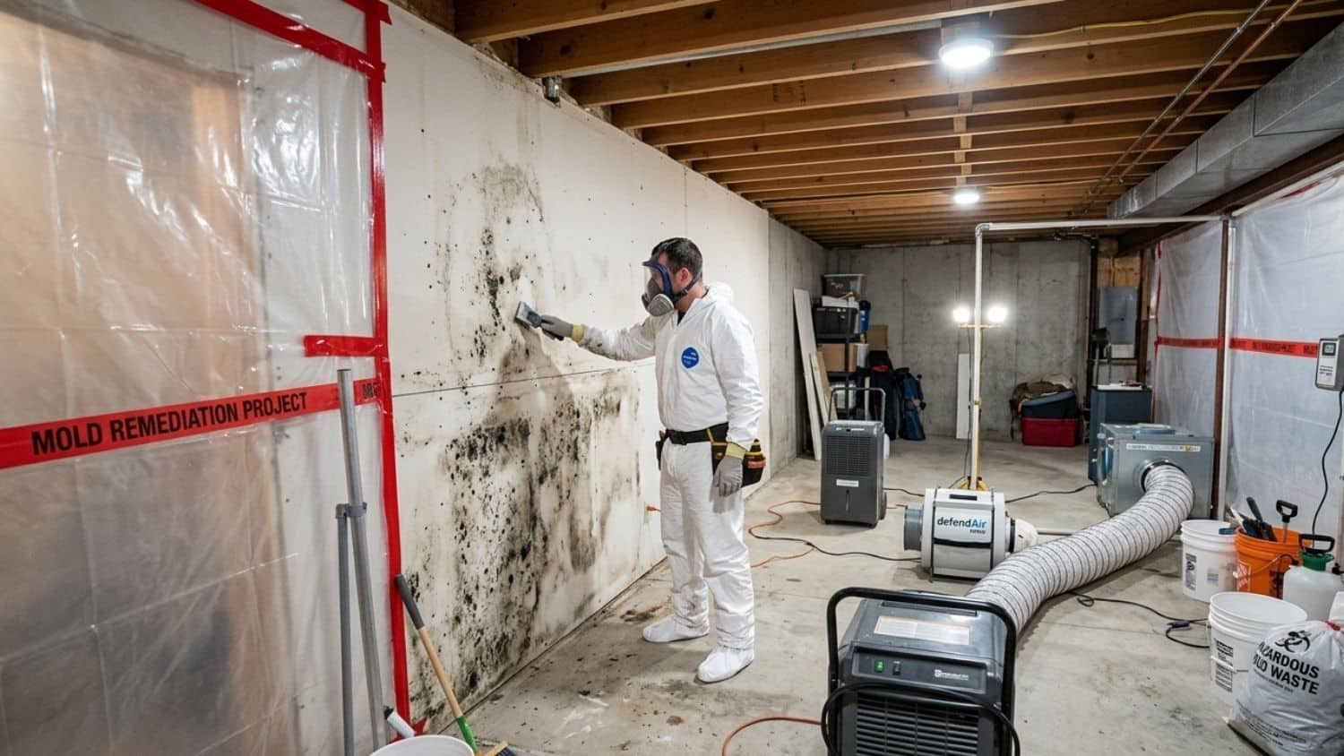 Negative air pressure containment barriers stop mold from spreading to clean areas during the remediation process.